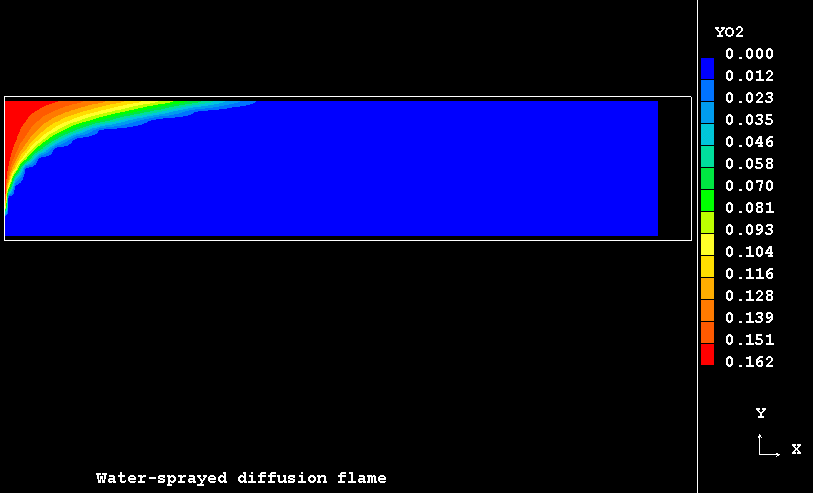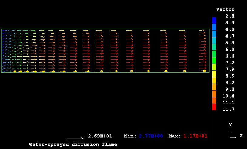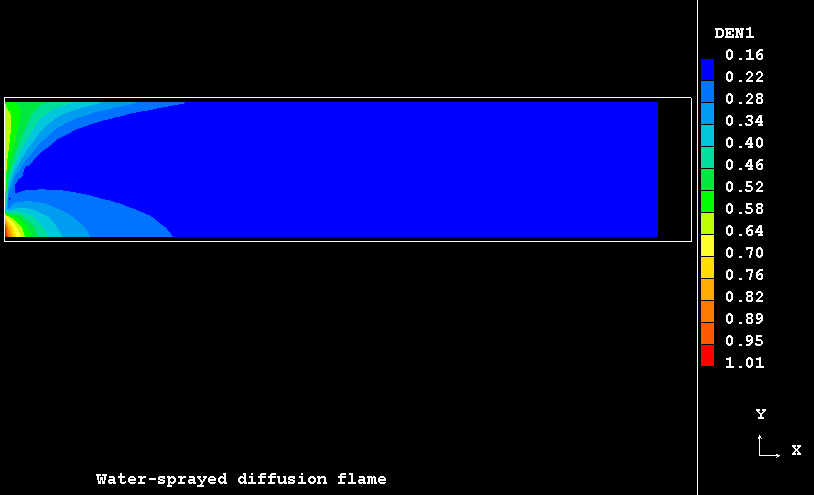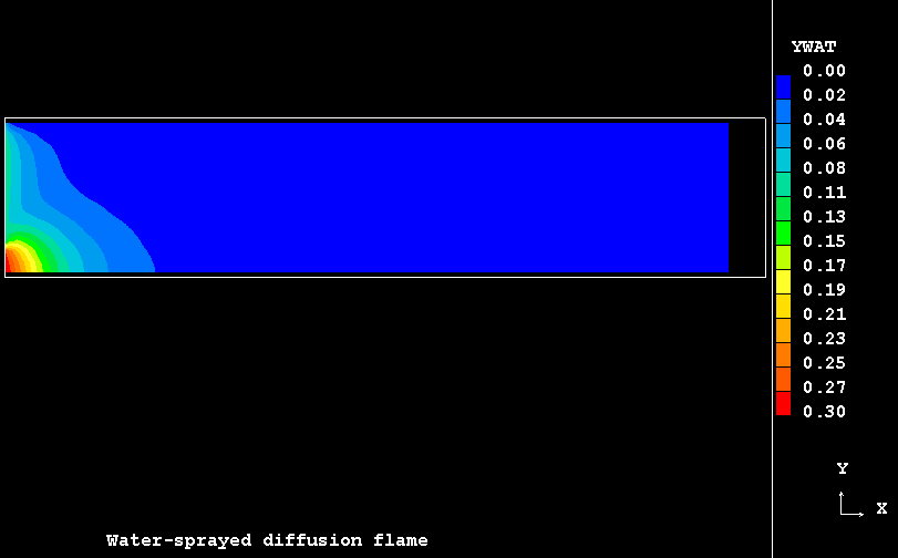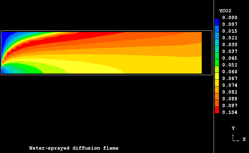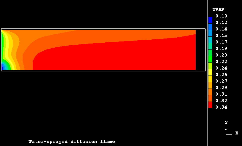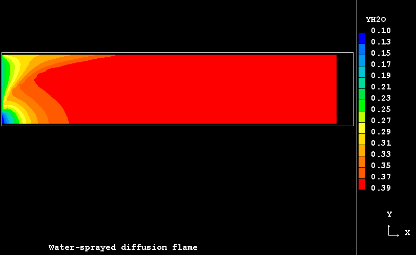 The case presents the implementation in PHOENICS of an extension for SCRS model to handle the turbulent flow, mixing and evaporation of a finely dispersed water droplets in a co-flowing combusting streams resulting from the admission of two separate coaxial turbulent jets of gaseous fuel and oxidant into a duct.
