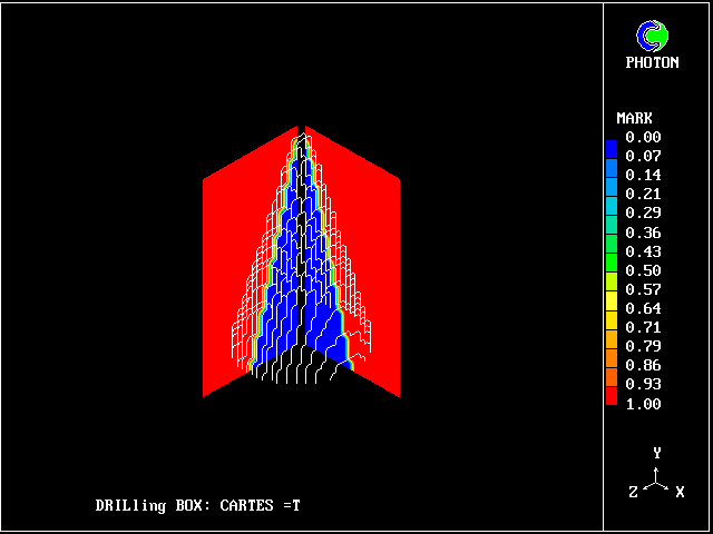 Four different cases, in which the one spherical drill bit is used to get different shapes, are arranged as unsteady problem: at each time moment the new marker distribution is PLANTed calculated and dumped into specified file to be viewed by PHOTON commands supplied