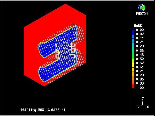 This input demonstrates the "drilling-milling" technique available in PLANT to generate marker distribution to fit the complex shapes on cartesian grids. The method rests on PLANT ability to handle virtually "live" mathematical expressions as the arguments of its functions.