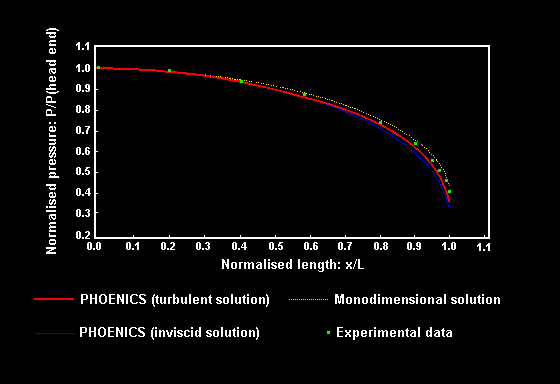 Pressure distribution vs normalised axial distance.Both experimental and PHOENICS results are shown.