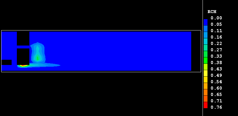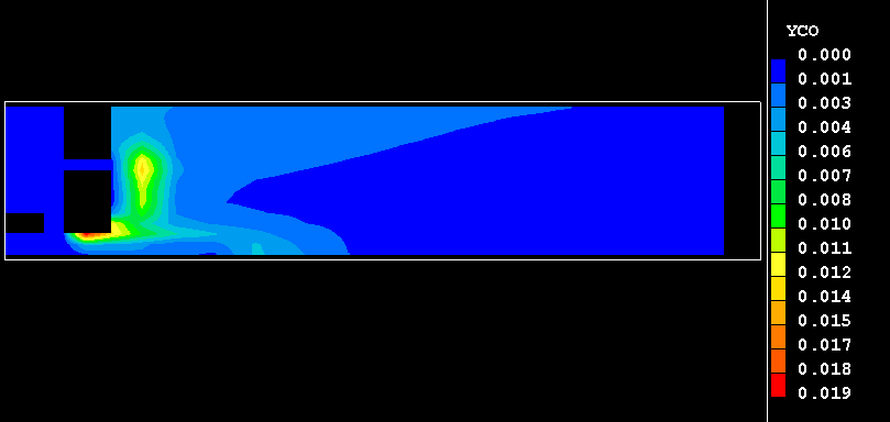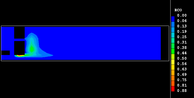 The constant reaction heats, i.e. the heats of combustions for fuel methane, H°CH4, and carbon monoxide, H°CO, are released with the rates of their consumptions. In terms of the transport equation for H1, the source term for specific enthalpy, in J/s, due to combustion of CH4 and CO is: