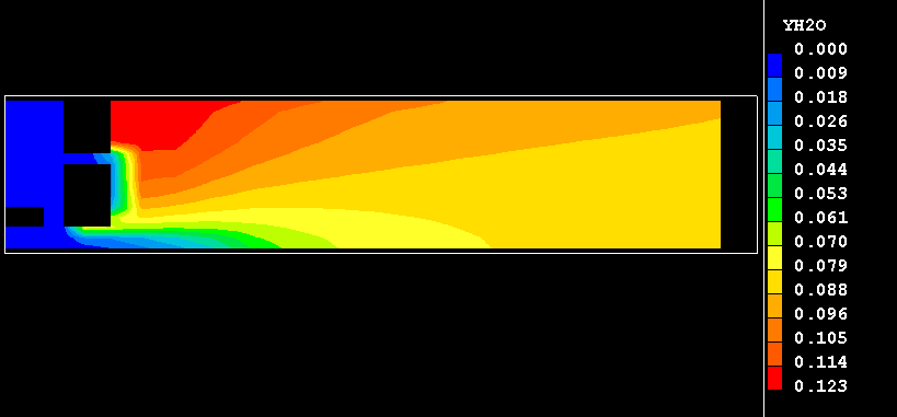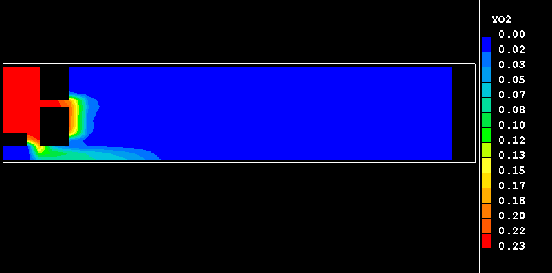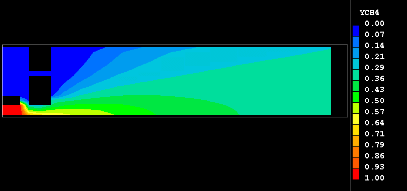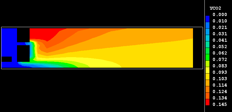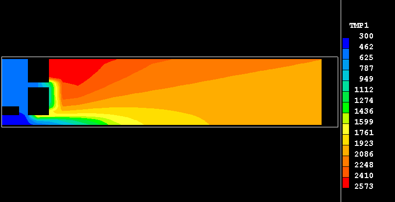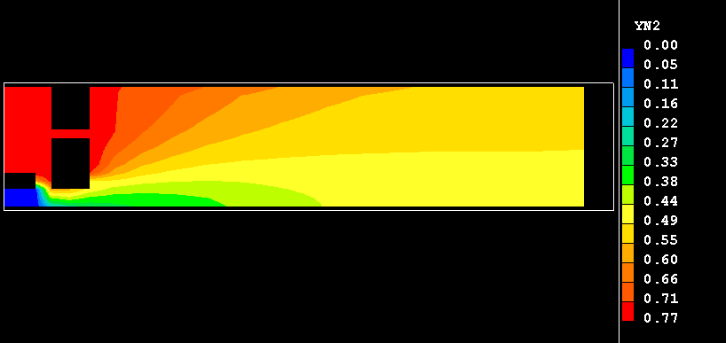 The present example consists of an plane-symmteric burner in which methane burns in a stream of heated air. The fuel and oxidant are introduced through separate streams into the burner. The fuel enters through a duct on the symmetry plane of the burner, and the air is introduced through an annual inlet into a chamber surrounding the fuel duct. Therein, the air is divided in two streams: one of them, primary air, is injected straight into the fuel stream, with the remaining, secondary, air being supplied through the orifice into the downstream recirculation region as depicted here.