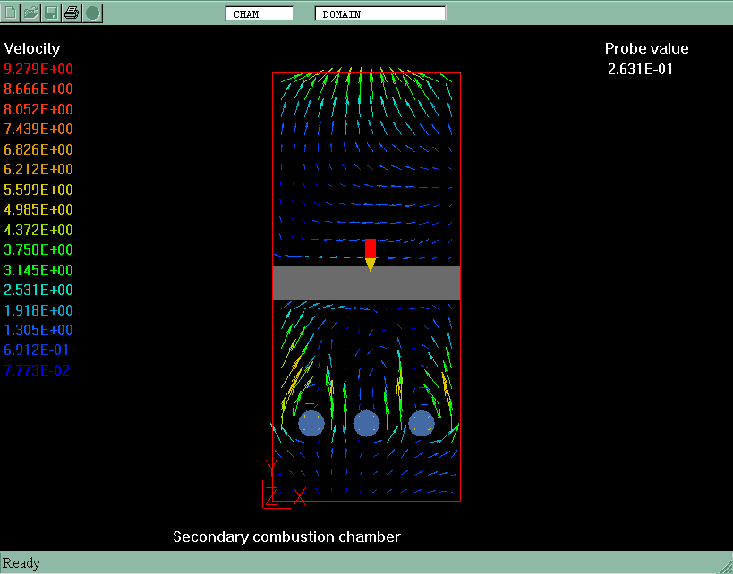 The combustion chamber chosen for the present computations retains all major features of real-life industrial equipment: rectangular shape of 920x2100x2400 mm; inlet of primary gas mixture at the bottom; high temperature burner product mixture input at the chamber wall; injection of secondary air through ports in the other; and secondary combustion product discharge at the top.