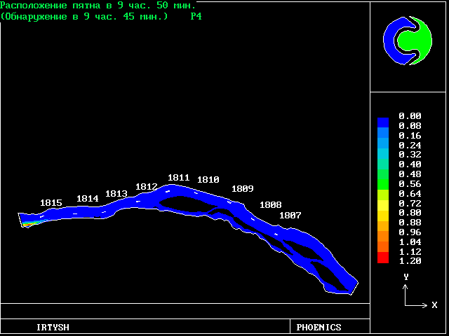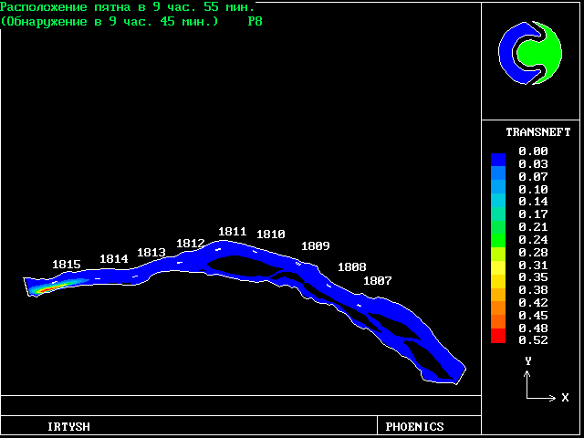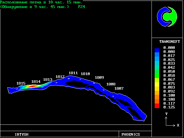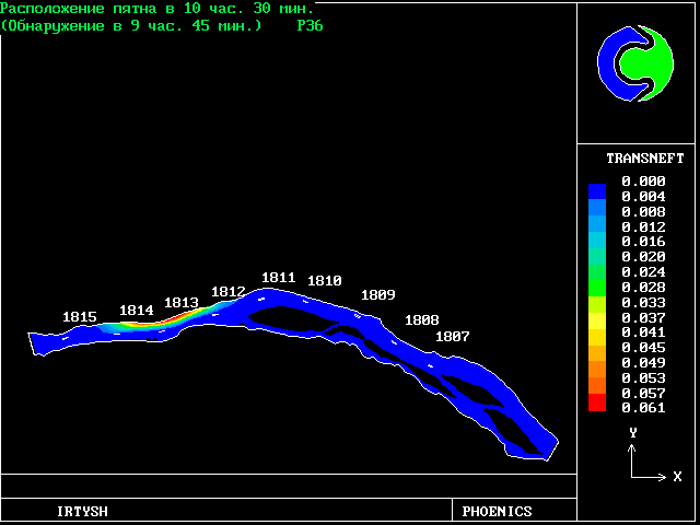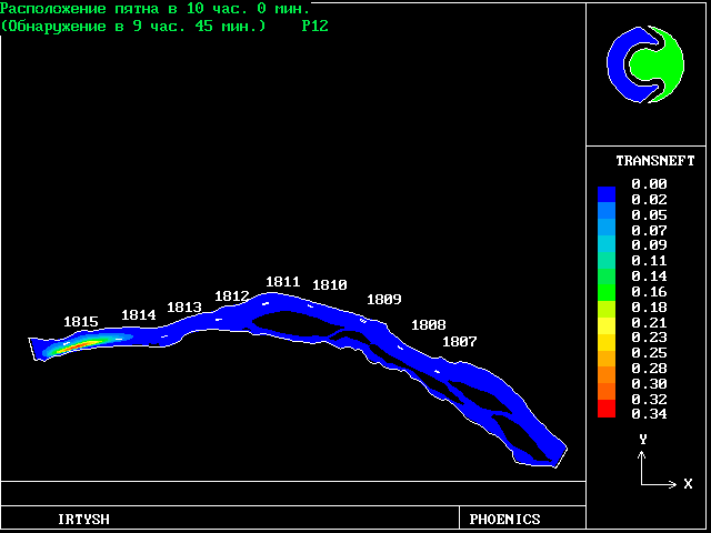 The following nine pictures show the predicted oil concentrations at 5-minute intervals after the occurrence of the spill.
