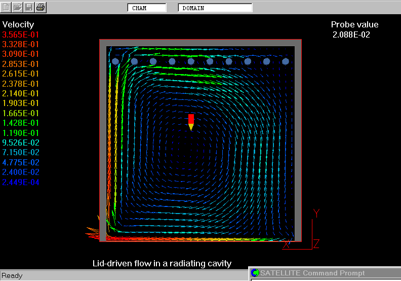 This simulation analyses the flow in a chamber, the floor of which moves with a constant velocity, 1m/s. The stationary walls are adiabatic, the moving wall is at a 300K.