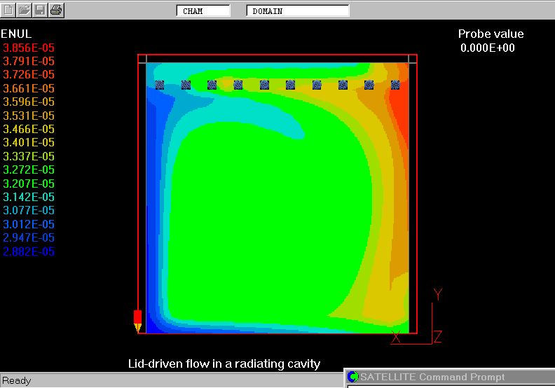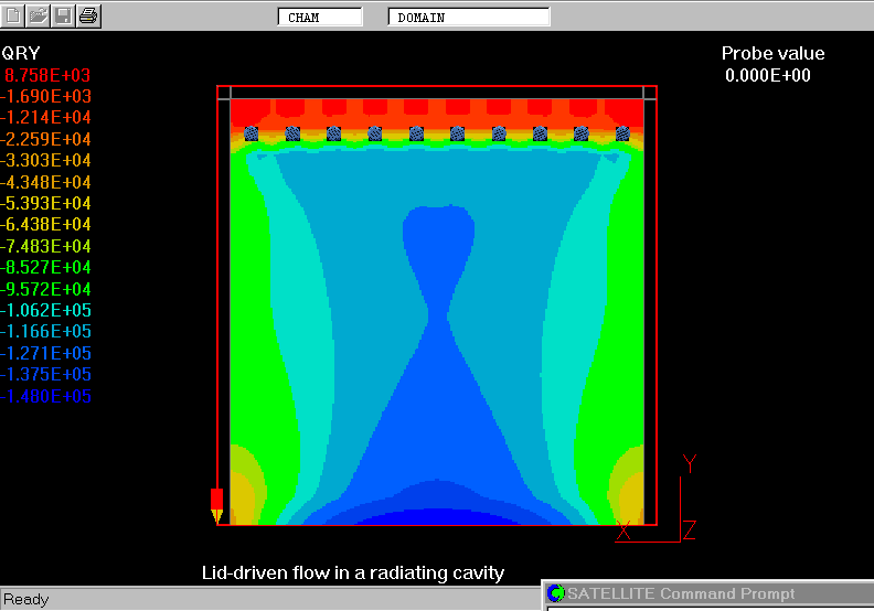 The plots show the distribution of the velocity vectors, temperature and X-, Y-direction radiant heat fluxes within the enclosure.