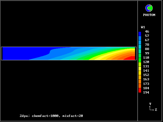 Not surprisingly, the upward-moving fluid has a higher temperature than the downward-moving fluid.