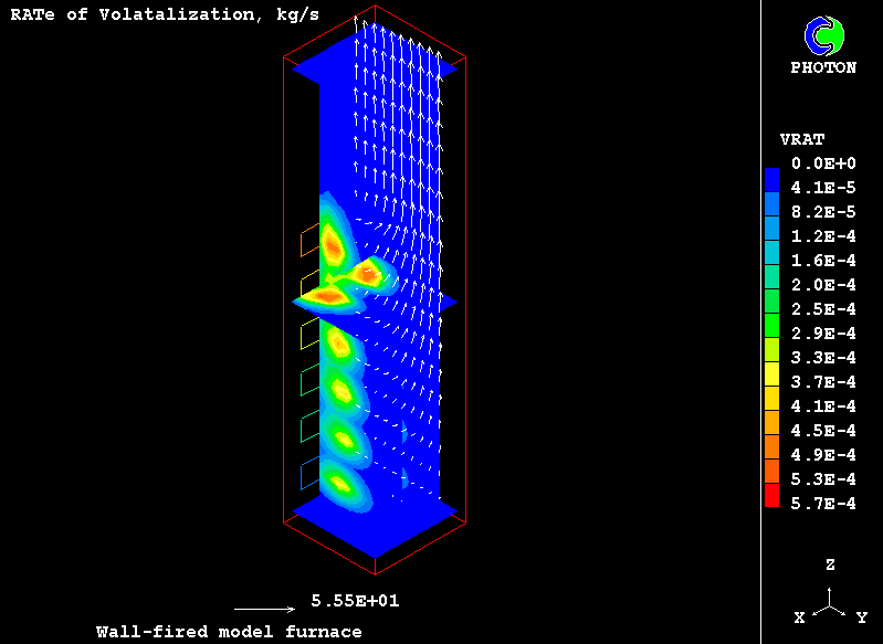 Turbulent combustion of volatiles is modelled via two-step reaction of hydrocarbon oxidation, in which carbon monoxide is an intermediate product.