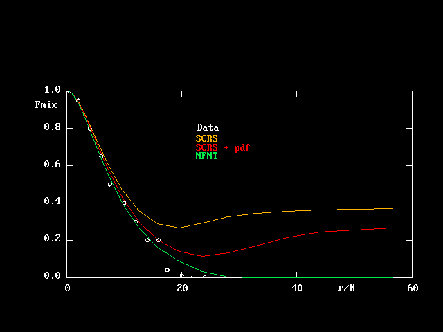 Figure 7. Predictions ( solid lines ) and measurements of Razdan and Stevens ( points ) for radial profiles, at Z/D =40, for the mixture fraction.