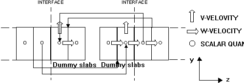 The need for the additional two slabs is based on the staggered-grid geometry that PHOENICS uses for the velocity components. The exchange of the boundary values proceeds in a parallel manner when synchronous communication is used.
