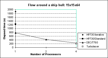 From the same figure it is clear that the DEC Servers are much faster than the HP735 (even when it runs on one processor), and reasonable speed-up can be achieved with 4 processors, although this case is too small for parallel systems.
