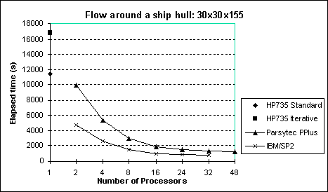 This test case was benchmarked on a HP735 and DEC Alpha Servers (7760 and Turbolaser). Results from the Standard LES and the Iterative (conjugate gradient) solver are also presented in the figure below.