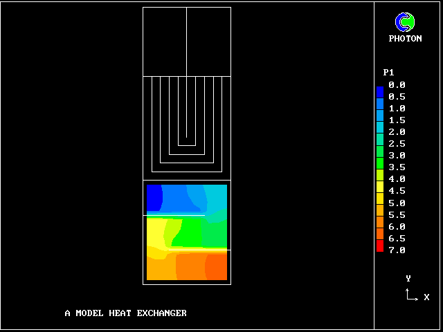 A series of PHOTON plots describe the fluid movements and temperature distribution in model heat exchanger.