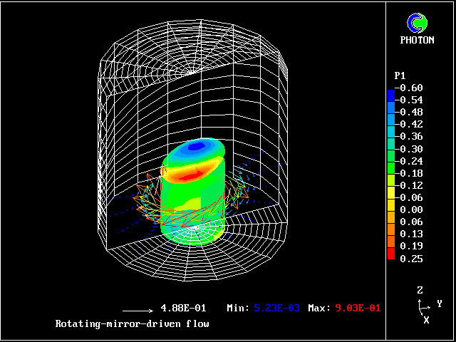 Pictures as follows : A series of PHOENICS PHOTON plots describing the fluid movement as velocity vectors and pressure contours.