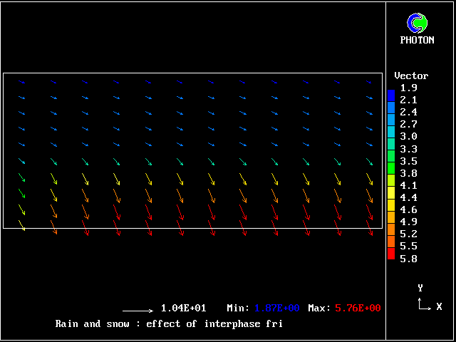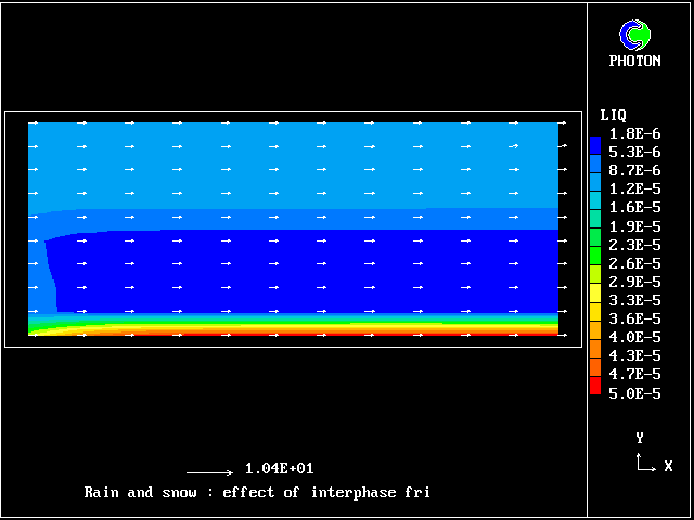 PLANT is used to introduce patchwise discontinuity in interphase friction distribution: the particulate phase fragments in the bottom part of the domain are much less influenced by air, than the ones of the upper part. The inspection of PHOTON pictures show what happened near the ground: the gravitational sedimentation is increased and the air becomes purer.