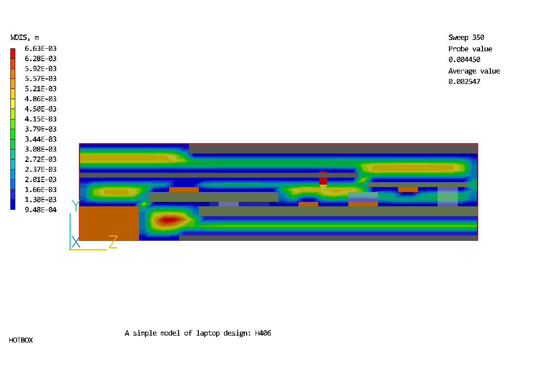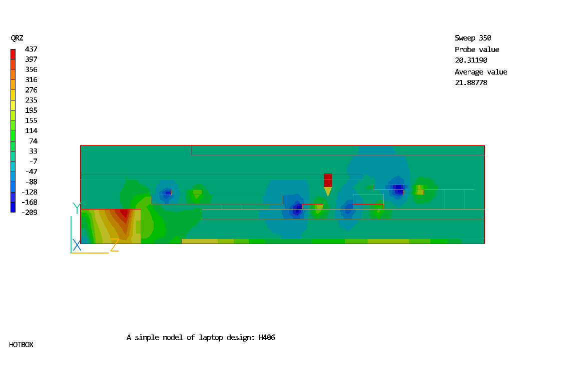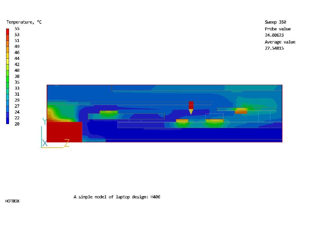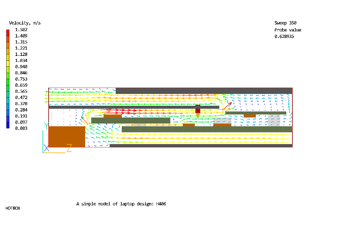 The flow and temperature distributions in the simplified portable laptop unit are predicted in this case.