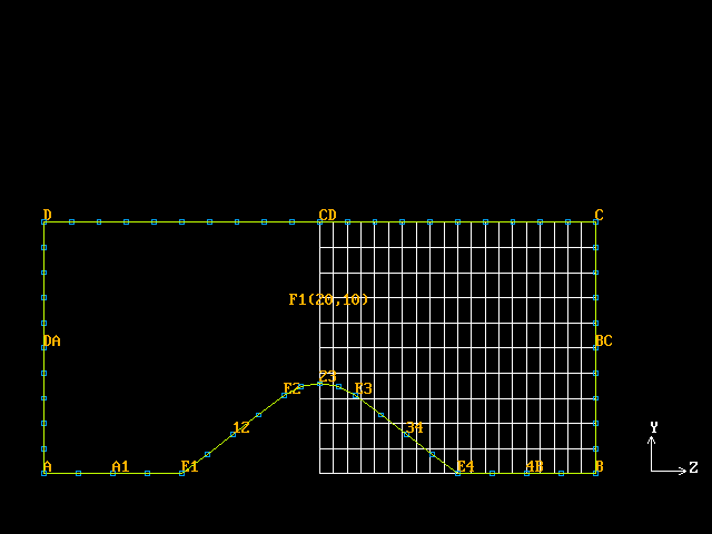 GSET(L,A1,A,E1,4) GSET(L,12,E1,E2,4) GSET(L,23,E2,E3,4,ARC,0,Y2,0) GSET(L,34,E3,E4,4) GSET(L,4B,E4,B,4) GSET(L,BC,B,C,10) GSET(L,CD,C,D,20) GSET(L,DA,D,A,10)